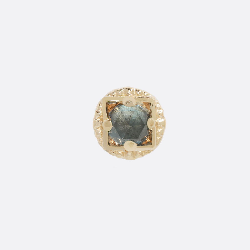 This stacked square entity uses a finely calibrated gemstone as the energy source for its dazzling presentation. OMEGA 24's textured outer ring frames the square four-point setting with light play from all angles, while a rose-cut London Blue Topaz shines at the center.