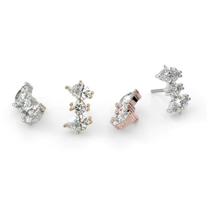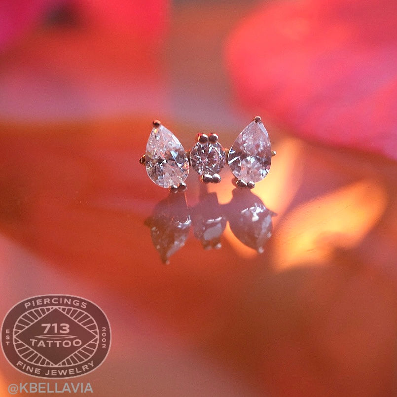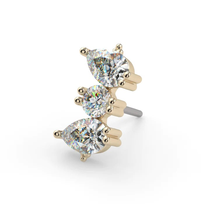 Mimir in the Norse mythology is the god of wisdom and knowledge, guardian of the sacred well that nourished the tree of life. This beautiful piece was designed by Sara from Athena Body Adornment. This End features a pair of 3x2mm pear shaped stones, with a center 1.75mm round stone. The charm size is 7mm x 4mm.