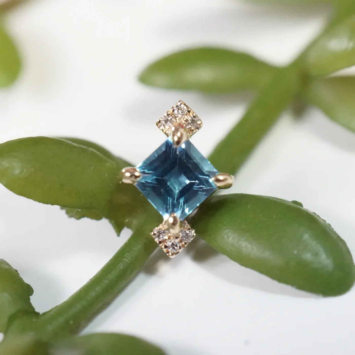 Princess cut gemstone with 3 diamond accents in 2 corners