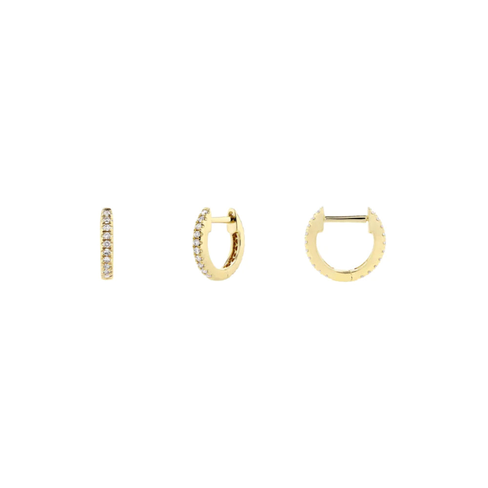 A diamond pavé set small hoop with a straight post that clicks into place. Diamonds set set all around the outside of the huggie. Easy to use and versatile.