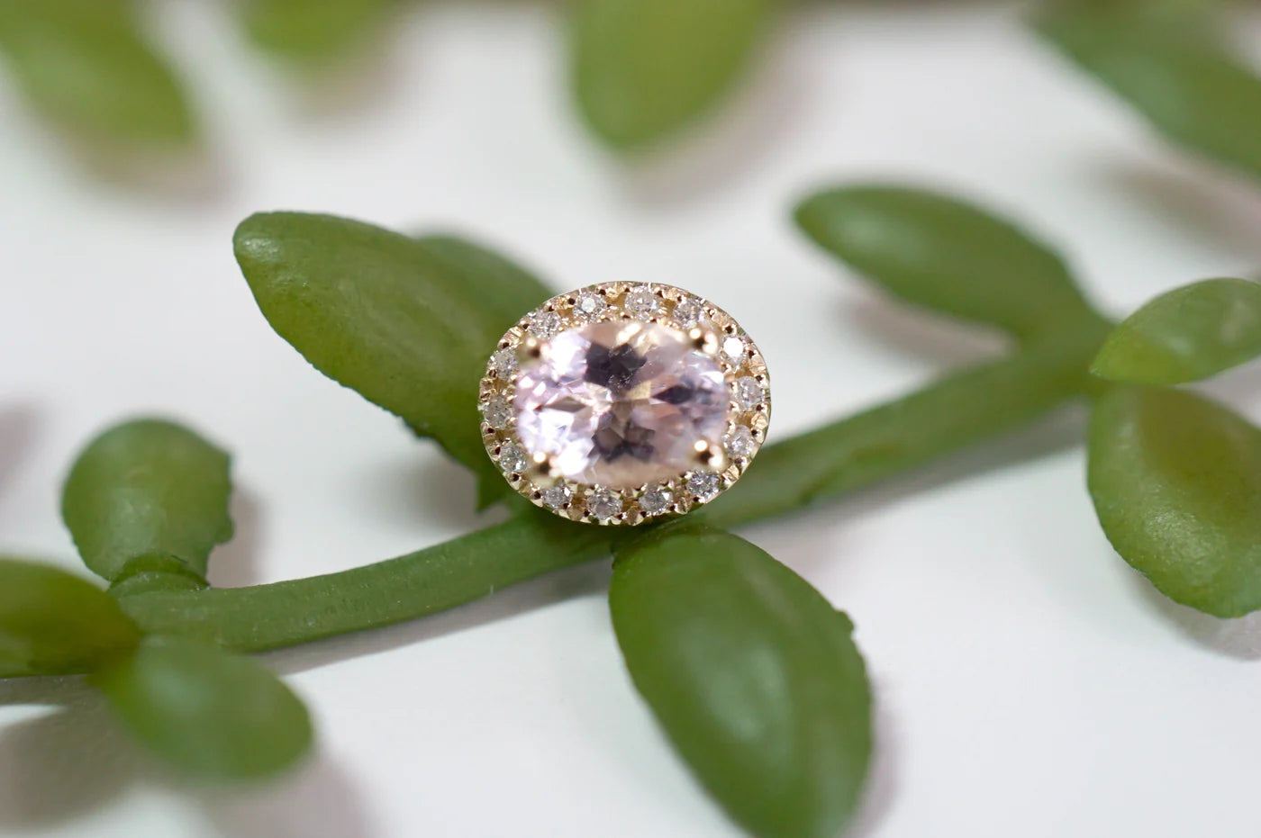 Faceted oval pink morganite surrounded with one row of diamonds threadless end.